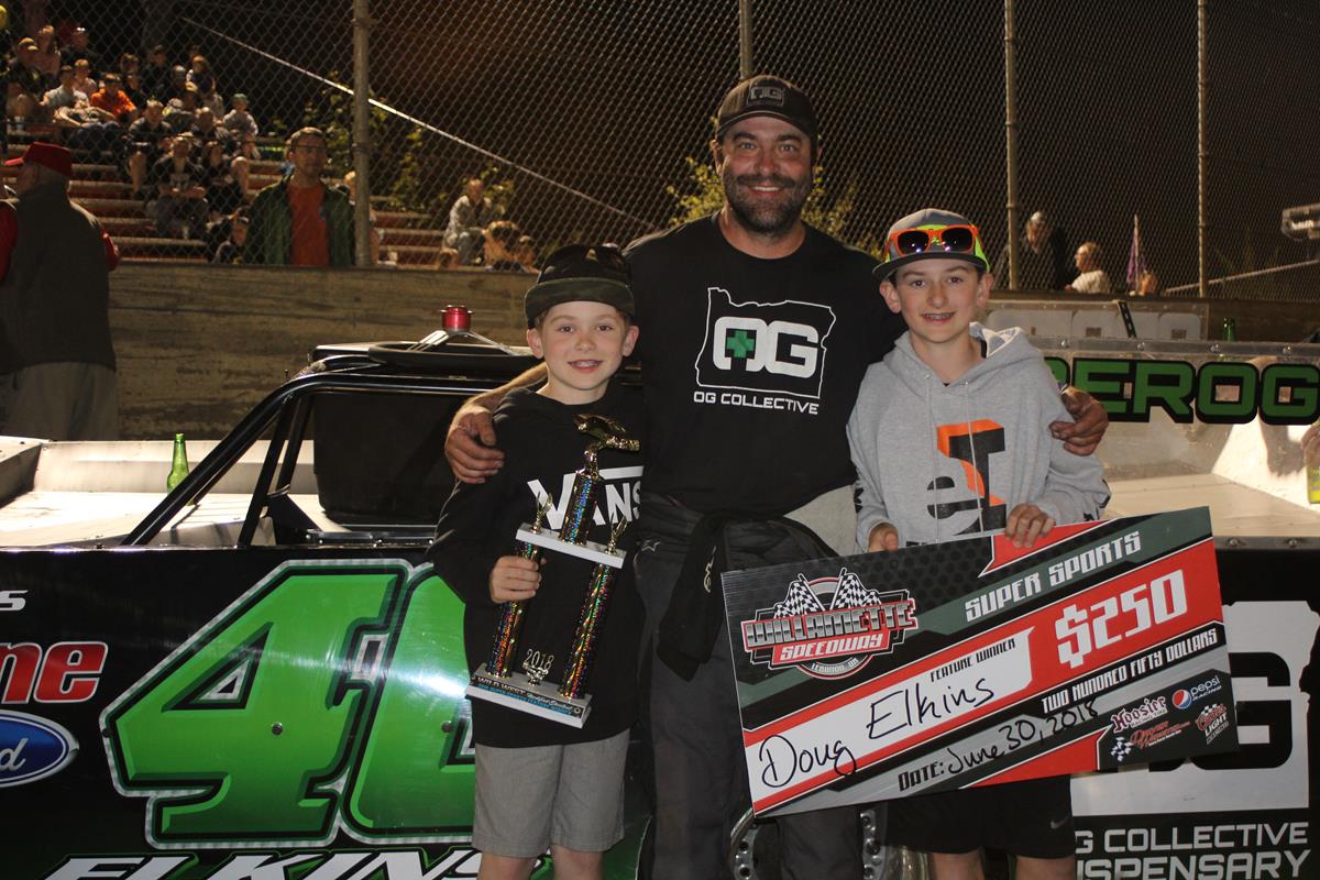 Doug Elkins, of Salem, tracked down and passed Beaudoin on the fourteenth trip around the speedway and set sail afterwards. He would go unchallenged and collected his second win of the season. Chris Mott, also out of Salem, was second while Randy Barley was third. Scotts Mills driver Vahn Stone placed fourth with Jody Tanner, from Portland, getting fifth.